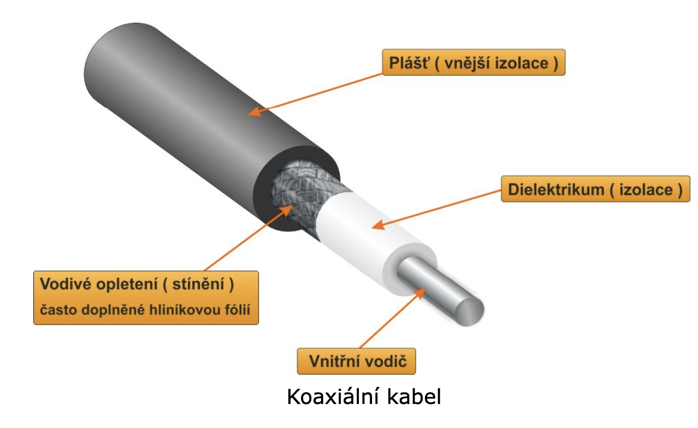 - Koaxiální kabel je tvořen dvěma soustřednými vodiči, od nichž je odvozen také název tohoto kabelu – coaxial znamená soustředný.