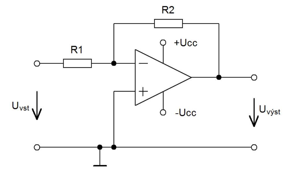 U tohoto zapojení je vstupní signál přiveden přes rezistor R1 na invertující vstup (-). Neinvertující vstup (+) je připojen na zem. Výstupní napětí je zesílené, ale s opačnou polaritou (fázově posunuté o 180°).