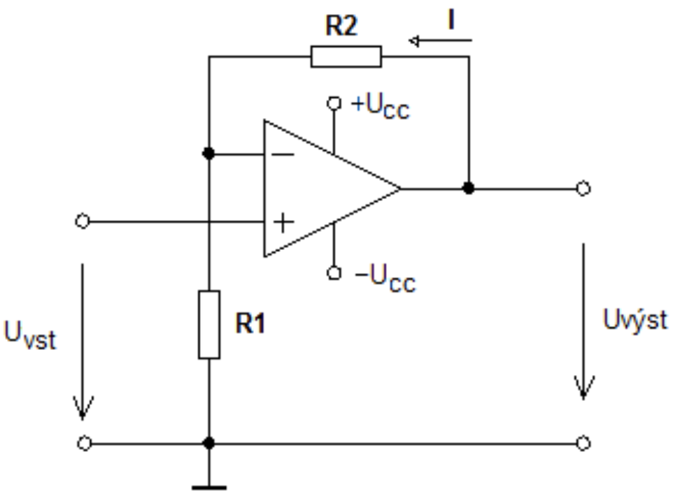 - Vstupní signál je přiveden přímo na neinvertující vstup (+). Zpětnovazební síť (dělič z rezistorů R1 a R2) je připojena na invertující vstup.