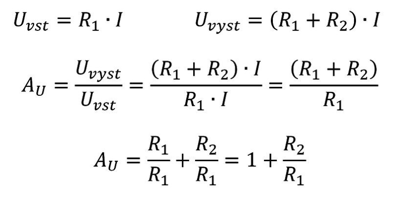 - Proud tekoucí rezistorem R1 () nemůže téci do vstupu OZ kvůli jeho vysoké impedanci, a proto musí celý protékat zpětnovazebním rezistorem R2. Podle I. Kirchhoffova zákona pro uzel na invertujícím vstupu platí: .
