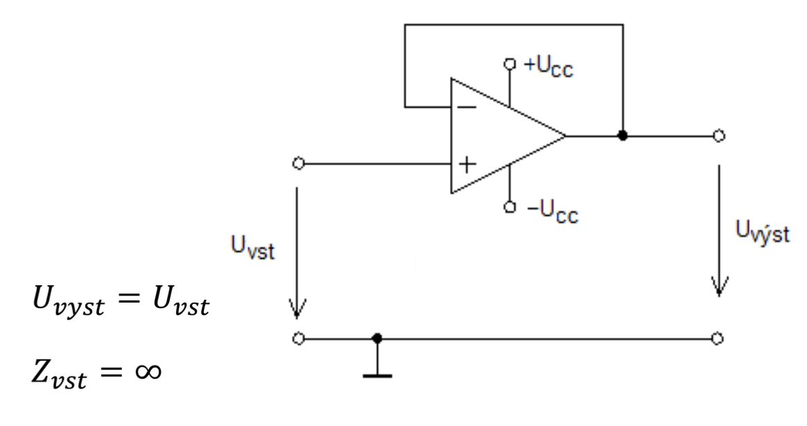 - Oproti invertujícímu zapojení má toto zapojení velmi vysokou vstupní impedanci (řádově MΩ až TΩ), která je dána vstupní impedancí samotného OZ a nezávisí na hodnotách rezistorů.
