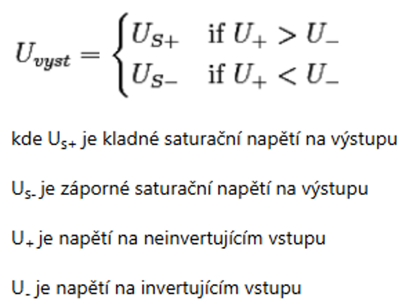 - Pokud U(+) < U(-), výstup se překlopí do záporné saturace.