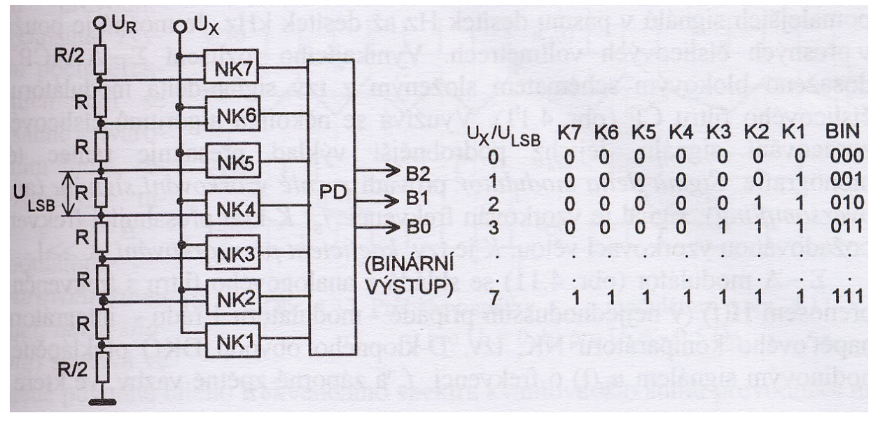 - Výstupem je binární číslo, které odpovídá nejvyšší úrovni napětí, které bylo překonáno.